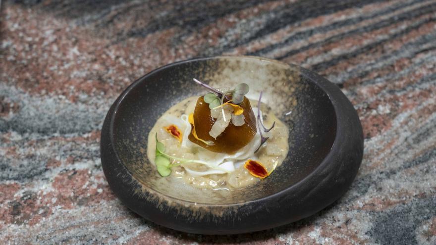 En este primer plato, se presenta una receta para hacer una salsa estilo carbonara que combina colmenillas (setas del día) y calamar gigante (calamar del Cantábrico). A continuación, se cuecen y pican las colmenillas, champiñones, cebolla y puerro, todo junto, y se añade nata para conseguir una densa base de salsa. Este será el principal atractivo del plato, aunque sin pasta.
