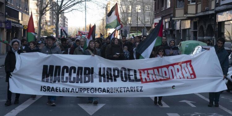Gaur arratsaldean, ehunka lagun bildu dira Vitorian, Israeleko saskibaloi taldeek Euroligako partiduetan parte hartzea salatzeko. Manifestazioa Kosner Baskonia eta Hapoel Tel-Aviv taldeek, ate itxian jokatuko duten partidarako antolatu da. Jendeak bere aurkako iritzia adierazi du, talde israeldarren presentzia ez baimentzearen aldeko mezuak emanez.
